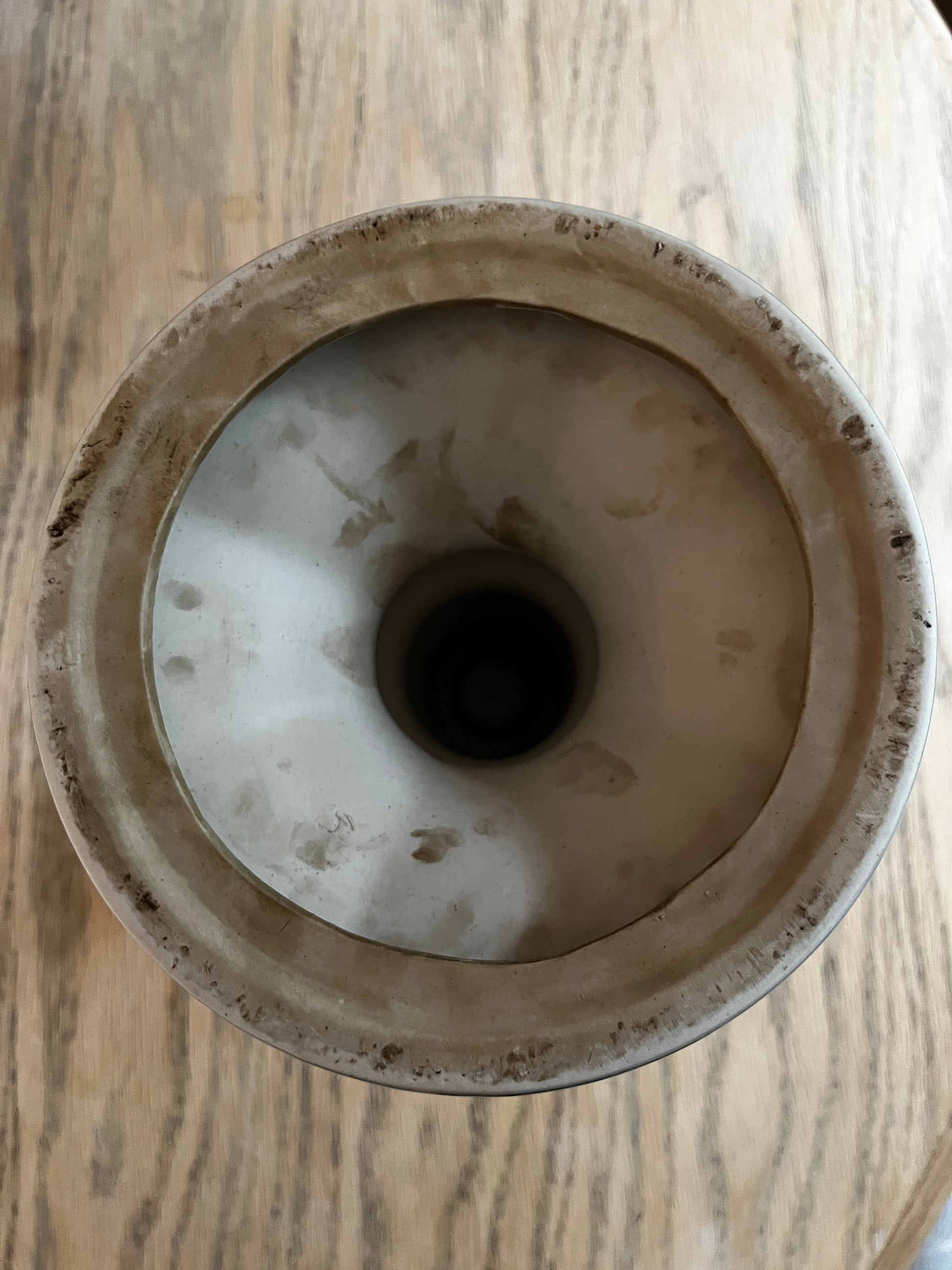 The underside shows an unglazed rim with kiln grit and natural wear. A decorative border mark encircles the base. The piece is well-balanced and of pleasing proportions, suitable for a bedside, mantel or table.