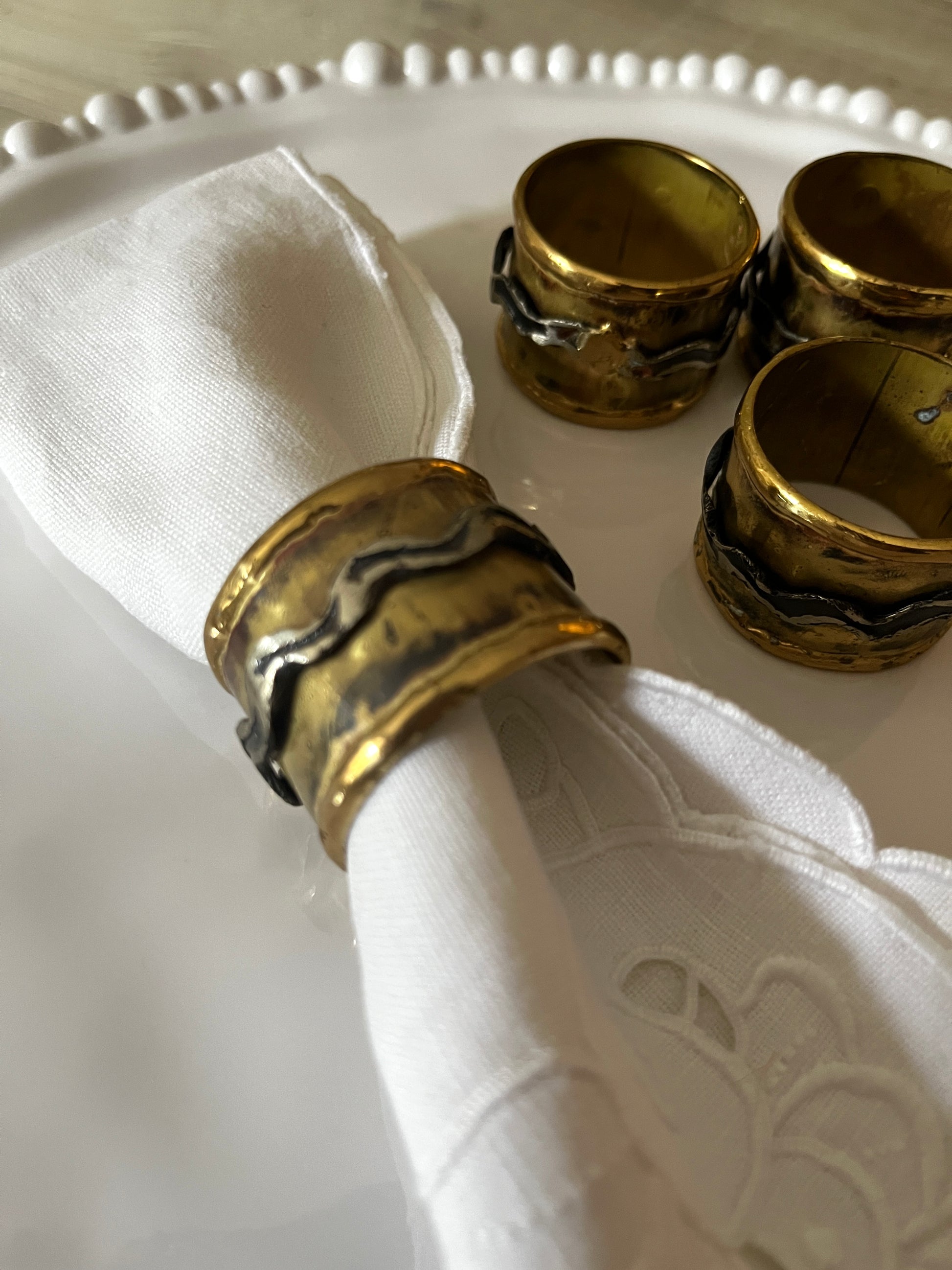 A lovely set of 4 napkin rings made with aged gold and silver metal.